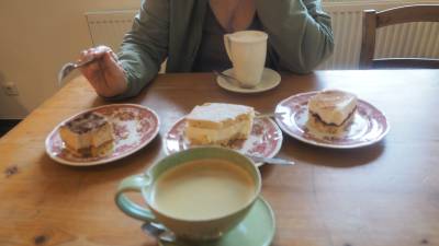 Als das Kaffee um 14 Uhr öffnete, gehen wir hin und probieren drei der leckeren Kuchen aus. es folgt ein Spaziergang, 3km. Auf der Sonnenseite des Tals gab es eine Ausruhbank, wo wir für gut eine halbe Stunde ruhten. Bräunen. Auf dem Rückweg gab es im Kaffee Abendessen, Platte, Kochkäse und dazu Schlösser. Abends wir der erste Film fertig und wir öffnen einen Rubino Spätburgunder.